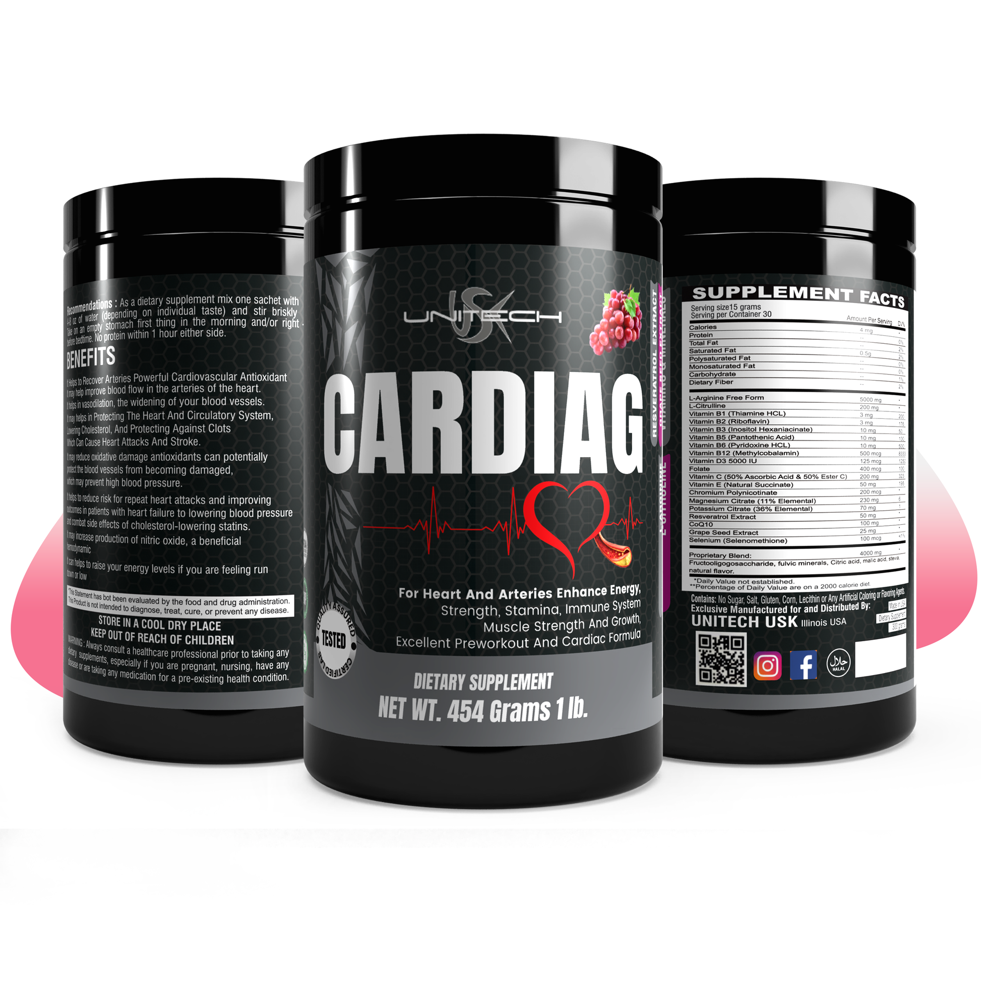 Unitech USK | Cardiag Grape Powder | Natural Supplement for Cardiovascular Support | L-Arginine, L-Citrulline, Grape Seed Extract, Resveratrol, and Coenzyme Q10 | 16 oz