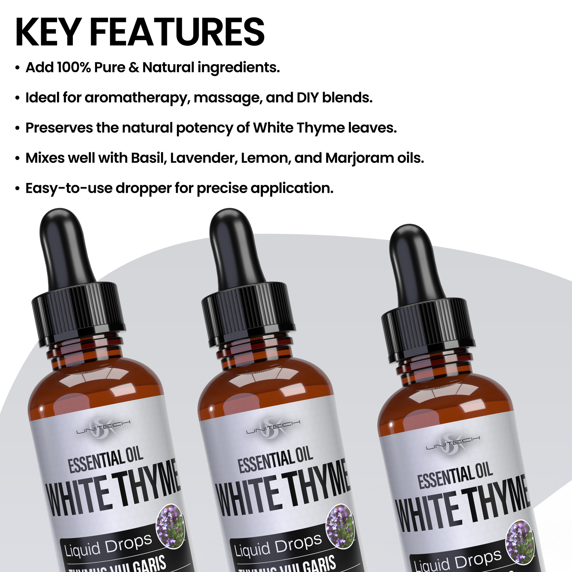 Unitech USK White Thyme Essential Oil | 100% Pure & Natural Thymus Vulgaris | Therapeutic Grade for Aromatherapy Diffuser | Relaxation & Massage Oil | Blends with Basil, Lavender, Lemon & Marjoram | 30ml