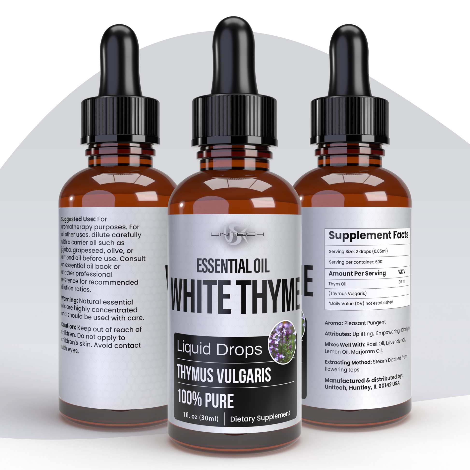 Unitech USK White Thyme Essential Oil is extracted from the flowering tops of Thymus Vulgaris through a meticulous steam distillation process. Renowned for its uplifting, empowering, and clarifying properties, this 100% pure essential oil offers a versatile solution for aromatherapy diffuser, wellness, and personal care.